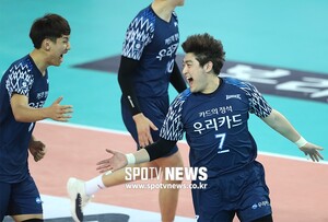 [스포티비뉴스=인천, 한희재 기자] 대한항공과 우리카드의 2018-2019 도드람 V리그 남자부 경기가 7일 오후 인천 계양체육관에서 열렸다. 우리카드 유광우가 팀 득점에 기뻐하고 있다.