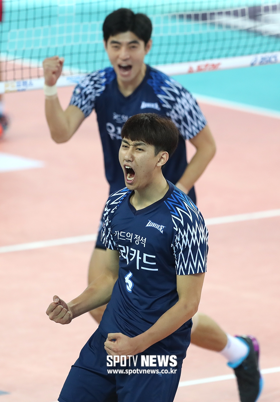 [스포티비뉴스=인천, 한희재 기자] 대한항공과 우리카드의 2018-2019 도드람 V리그 남자부 경기가 7일 오후 인천 계양체육관에서 열렸다. 득점을 올린 우리카드 한성정이 기뻐하고 있다.