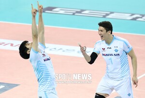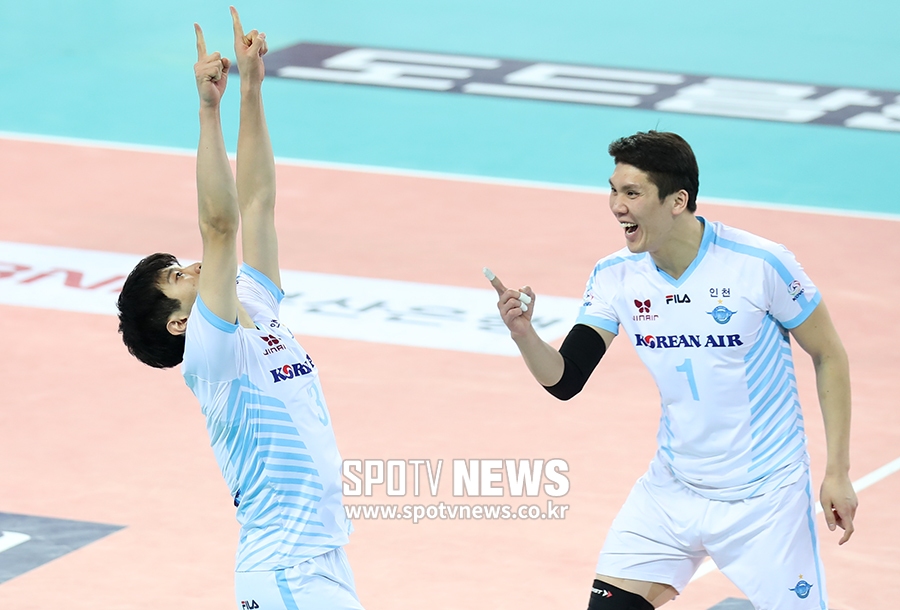 [스포티비뉴스=인천, 한희재 기자] 대한항공과 우리카드의 2018-2019 도드람 V리그 남자부 경기가 7일 오후 인천 계양체육관에서 열렸다. 승리의 블로킹을 한 대한항공 황승빈이 기뻐하고 있다.