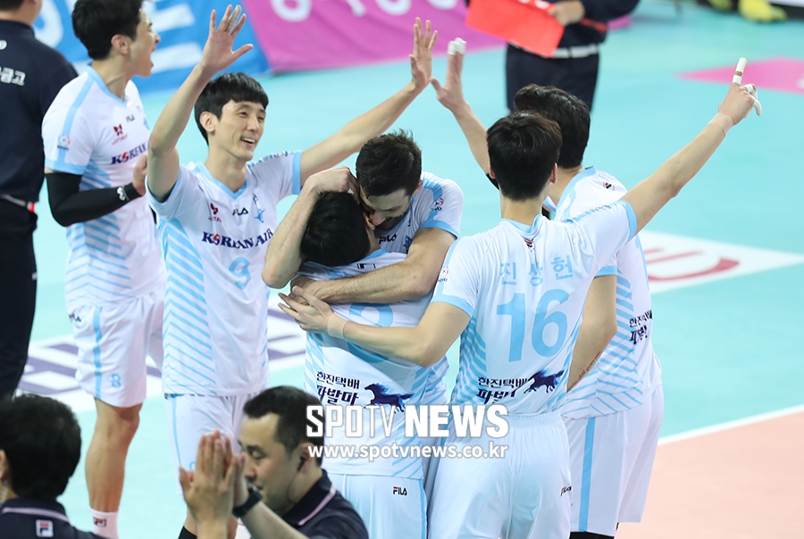 [스포티비뉴스=인천, 한희재 기자] 대한항공과 우리카드의 2018-2019 도드람 V리그 남자부 경기가 7일 오후 인천 계양체육관에서 열렸다. 3-2 역전승을 거둔 대한항공 선수들이 기뻐하고 있다.