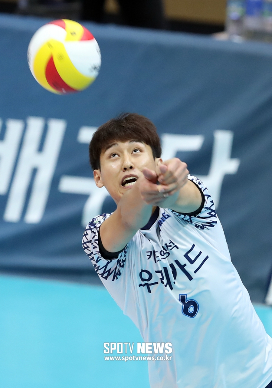 [스포티비뉴스=수원, 한희재 기자] 한국전력과 우리카드의 2018-2019 V리그 남자부 경기가 12일 오후 경기도 수원실내체육관에서 열렸다. 우리카드 나경복이 득점을 올린 한성정과 하이파이브를 하고 있다. 우리카드 한성정이 공을 살려내고 있다.