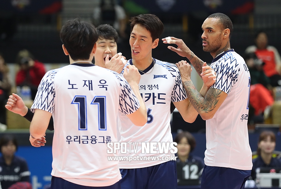 [스포티비뉴스=수원, 한희재 기자] 한국전력과 우리카드의 2018-2019 V리그 남자부 경기가 12일 오후 경기도 수원실내체육관에서 열렸다. 득점을 올린 우리카드 윤봉우가 하이파이브를 하고 있다.