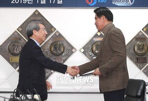 [스포티비뉴스=서울, 곽혜미 기자] KBO 기술위원회 첫 회의가 17일 오후 서울 강남구 도곡동 KBO 야구회관에서 열렸다. 정운찬 KBO 총재가 김시진 기술위원장에게 위촉장을 전하고 있다.