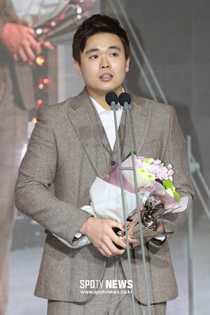 [스포티비뉴스=서울, 곽혜미 기자] 2018 신한은행 마이카 KBO 시상식이 19일 오후 서울 강남구 역삼동 르 메르디앙 호텔에서 열렸다. 홈런상, 타점상을 수상한 퓨처스 남부 리그 문상철이 수상 소감을 말하고 있다.