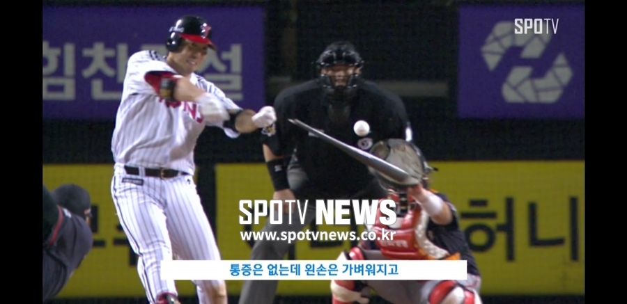 "2스트라이크가 됐고 런앤드히트가 자연스럽게 걸리는 상황이었다. 스윙을 하는데 뭔가 귀에서 '지지직' 하는 소리가 들렸다. 이게 무슨 소리지? 난 내 어깨가 찢어진 줄 알았다. 내 어깨가. 그런데 아무렇지 않더라. 어깨에 통증은 없는데 왼손이 가벼워지더라. 부러진 방망이가 날아갔다. (손잡이만) 잡고 있는 오른손이 참 이상했다. '그럴 수 있나'라는 생각을 많이 했다. 방망이 제조 회사에 그대로 줬다. 환불해달라고(웃음)."