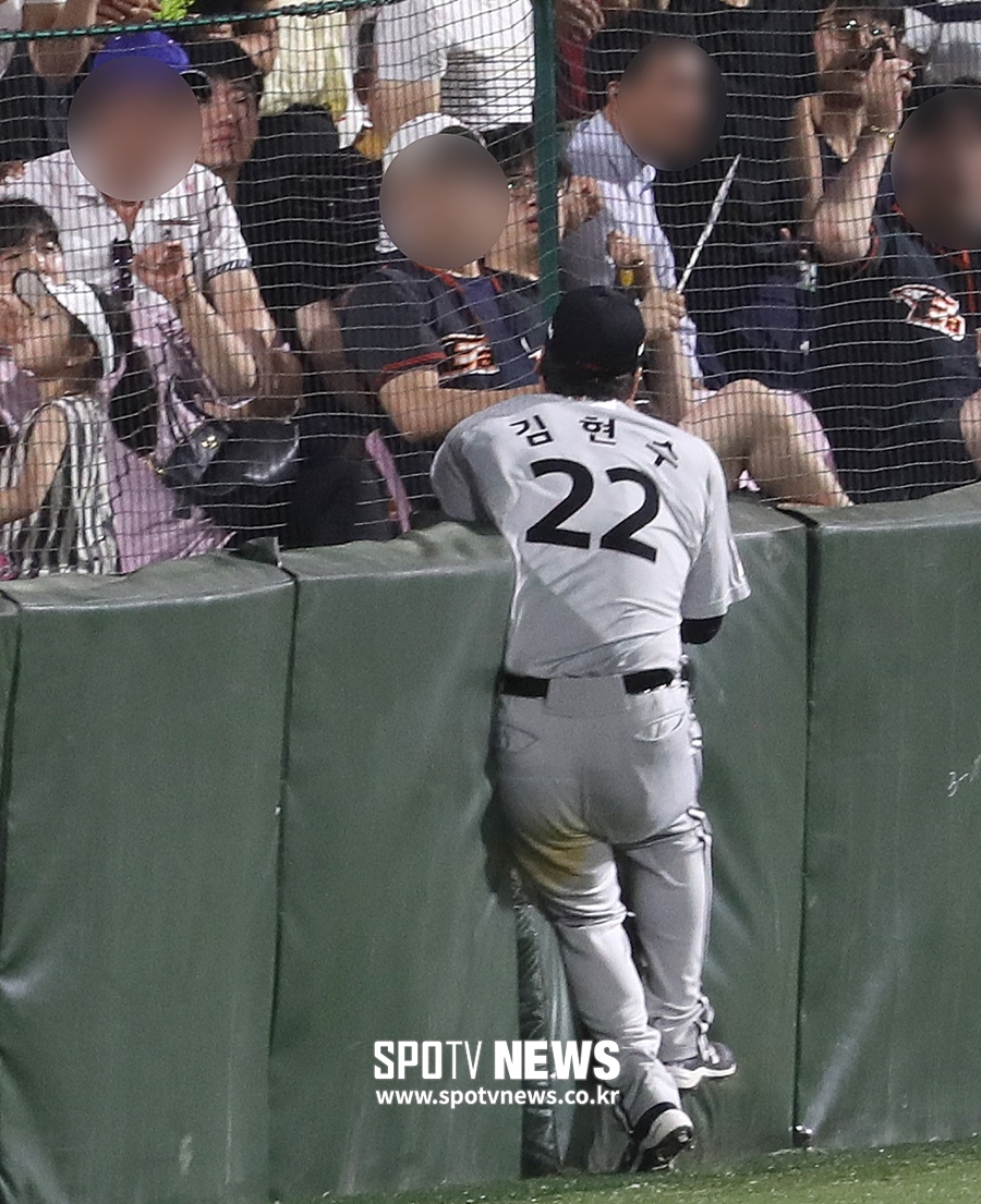 [스포티비뉴스=청주, 곽혜미 기자] '2018 신한은행 마이카 KBO 리그' 한화 이글스와 LG 트윈스의 경기가 21일 오후 청주야구장에서 열렸다. 6회말 1사 한화 정은원의 파울 플라이를 LG 좌익수 김현수가 몸을 날려 잡아내고 있다.
