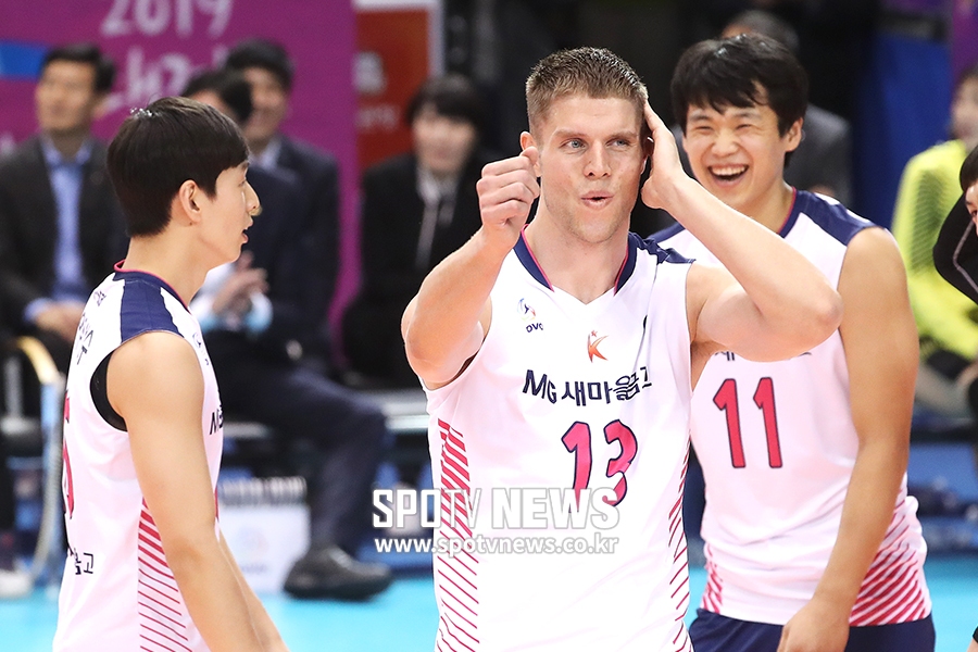 [스포티비뉴스=대전, 곽혜미 기자] 2018-2019 V리그 올스타전이 20일 오후 대전 충무체육관에서 열렸다. 최익제가 스파이크 서브를 넣고 있다. 득점에 성공한 타이스가 춤을 추고 있다.