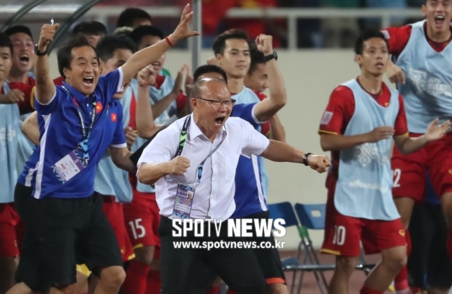 박항서 감독은 골이 터지자 크게 흥분하며 코칭스태프, 교체 자원들과 기쁨을 나눴다. 그리고 어느새 차분하게 흥분을 가라앉히고, 경기에 뛰는 선수들을 하나씩 불러 지시사항을 전달했다. 선수들은 박항서 감독의 말에 집중하며 다시 경기에 들어갔다.