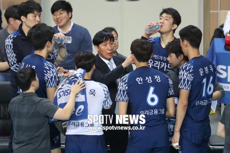 [스포티비뉴스=서울, 곽혜미 기자] 2018-2019 도드람 V리그 남자부 우리카드와 현대캐피탈의 경기가 3일 오후 서울 장충체육관에서 열렸다. 우리카드 신영철 감독이 작전 지시를 내리고 있다.