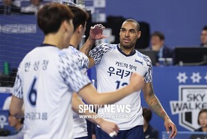 [스포티비뉴스=천안, 한희재 기자] 현대캐피탈과 우리카드의 2018-2019 도드람 V리그 남자부 경기가 27일 오후 충남 천안 유관순체육관에서 열렸다. 득점을 올린 우리카드 아마메즈가 하이파이브를 하고 있다.