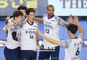 우리카드는 아가메즈와 나경복, 한성정의 ‘삼각편대’가 골고루 득점을 올렸다. ‘2m 7cm’ 아가메즈는 고비마다 중요한 득점을 기록하며 팀의 중심을 잡았다.
