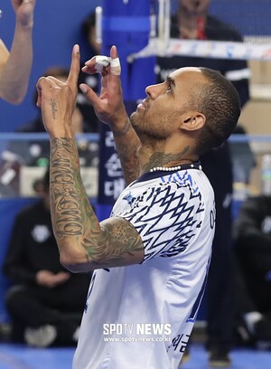 [스포티비뉴스=천안, 한희재 기자] 현대캐피탈과 우리카드의 2018-2019 도드람 V리그 남자부 경기가 27일 오후 충남 천안 유관순체육관에서 열렸다. 3-0 셧아웃 승리를 이끈 우리카드 아가메즈가 기뻐하고 있다.