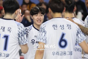 [스포티비뉴스=천안, 한희재 기자] 현대캐피탈과 우리카드의 2018-2019 도드람 V리그 남자부 경기가 27일 오후 충남 천안 유관순체육관에서 열렸다. 3세트 연속 서브 득점을 기록한 우리카드 최현규가 동료들과 하이파이브를 하고 있다.