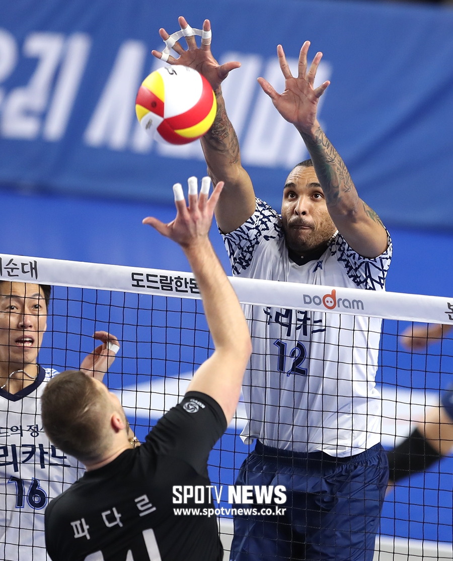 [스포티비뉴스=천안, 한희재 기자] 현대캐피탈과 우리카드의 2018-2019 도드람 V리그 남자부 경기가 27일 오후 충남 천안 유관순체육관에서 열렸다. 우리카드 아가메즈가 블로킹을 하고 있다.