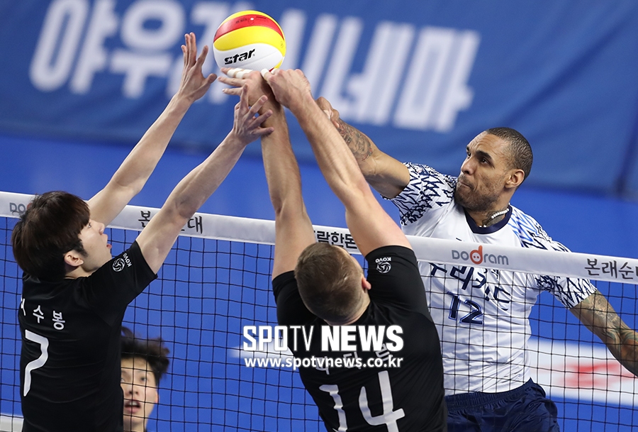 [스포티비뉴스=천안, 한희재 기자] 현대캐피탈과 우리카드의 2018-2019 도드람 V리그 남자부 경기가 27일 오후 충남 천안 유관순체육관에서 열렸다. 우리카드 아가메즈가 볼다툼을 벌이고 있다.