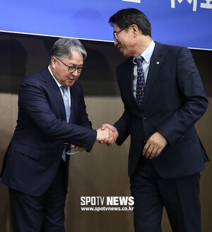 [스포티비뉴스=서울, 한희재 기자] 김경문 야구 국가대표팀 감독 선임 기자회견이 28일 오후 서울 강남구 도곡동 야구회관에서 열렸다. 김경문 감독이 김시진 기술위원장과 악수를 하고 있다.