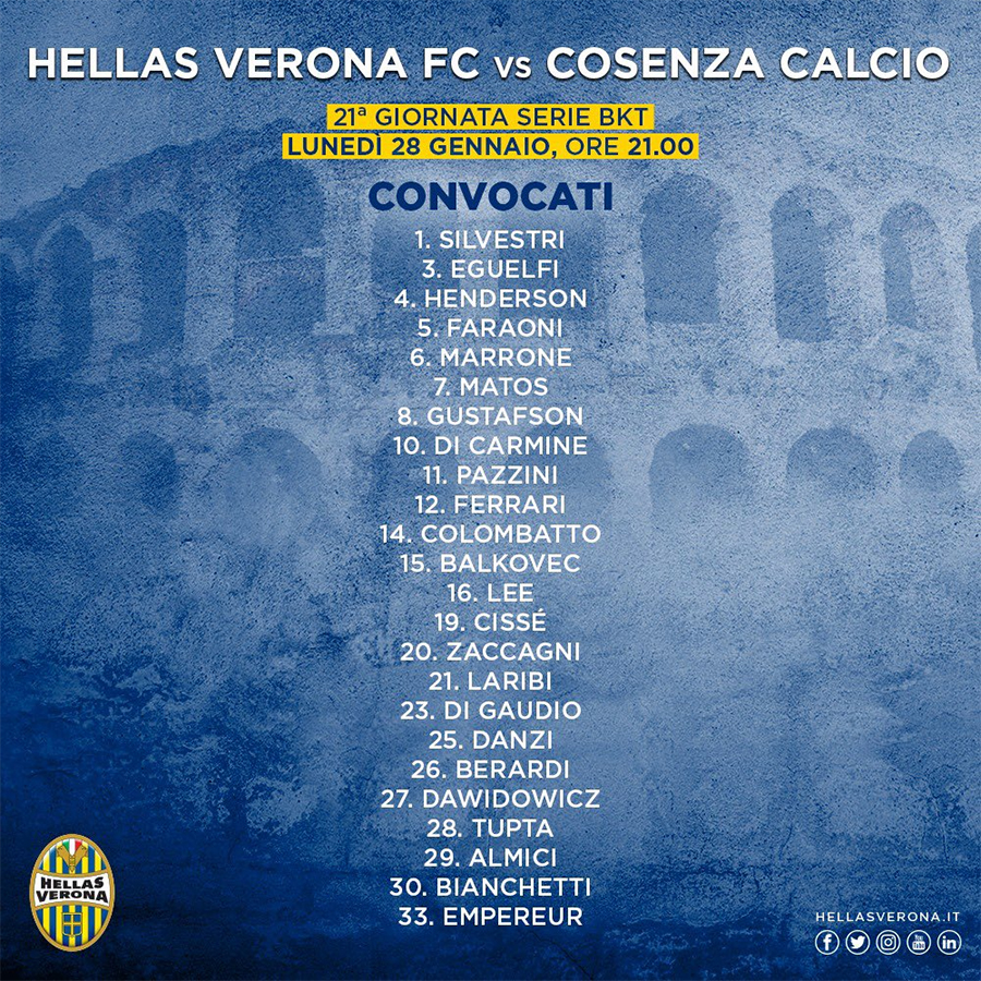 엘라스 베로나는 29일(한국시간) 구단 공식 홈페이지를 통해 누오바 코센차전 소집 명단을 발표했다. 베로나는 오전 5시 베로나 스타디오 마르크 안토니오 벤테고디에서 2018-19시즌 이탈리아 세리에B 21라운드를 치른다.