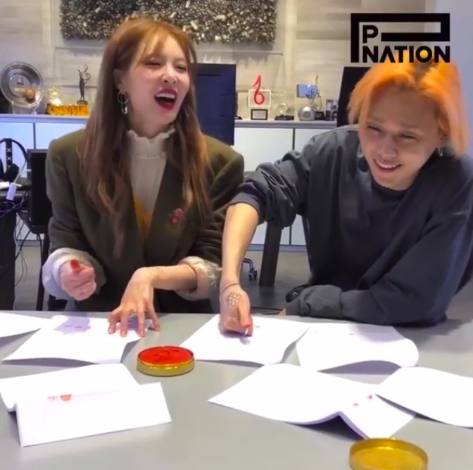 [스포티비뉴스=박수정 이슈팀 기자] 가수 싸이가 현아와 이던 커플이 계약서에 지장을 찍는 모습을 공개했다.