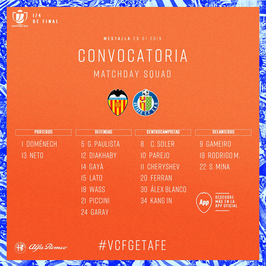 발렌시아는 오는 30일 오전 5시 30분(한국시간) 스페인 발렌시아 에스타디오 메스타야에서 헤타페와 2018-19시즌 스페인 코파델레이 8강 2차전을 치른다. 헤타페 원정 1차전에서 0-1로 패한 만큼, 홈에서 반드시 승리해야 한다.