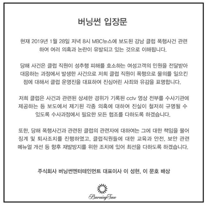 같은날 29일 저녁 클럽 버닝썬도 공식입장을 밝혔다. 버닝썬 측은 "이번 사건은 클럽 직원이 성추행 피해를 호소하는 여성 고객의 민원을 전달받아 대응하는 과정에서 일어난 사건으로 저희 클럽 직원이 폭행으로 물의를 일으킨 점에 대해서 클럽 운영진을 대표해 진심 어린 사죄와 유감을 표명한다"라고 사건을 해명했다.