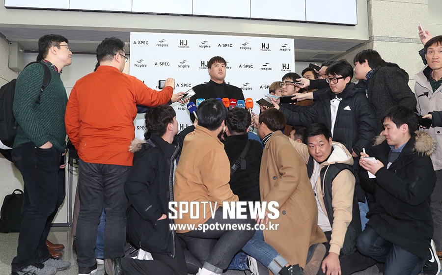 [스포티비뉴스=인천국제공항, 곽혜미 기자] LA 다저스 류현진이 메이저리그 일곱 번째 시즌을 준비하기 위해 30일 인천국제공항을 통해 미국으로 출국했다. 류현진이 인터뷰를 하고 있다.