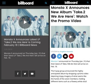 빌보드는 지난달 31일(현지 시각) 자사 홈페이지를 통해 "몬스타엑스가 2월 18일에 발매되는 최신 앨범 '테이크2. 위 아 히어'의 신보 소식을 발표했다"(Monsta X Announces Latest LP 'Take.2 We Are Here' Is Coming February 18)는 제목의 기사와 영상 뉴스를 게재했다.