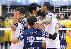 [스포티비뉴스=의정부, 한희재 기자] KB손해보험과 우리카드의 2018-2019 도드람 V리그 남자부 경기가 2일 오후 경기도 의정부체육관에서 열렸다. 3-0 셧아웃 승리르 거둔 우리카드 선수들이 기뻐하고 있다.