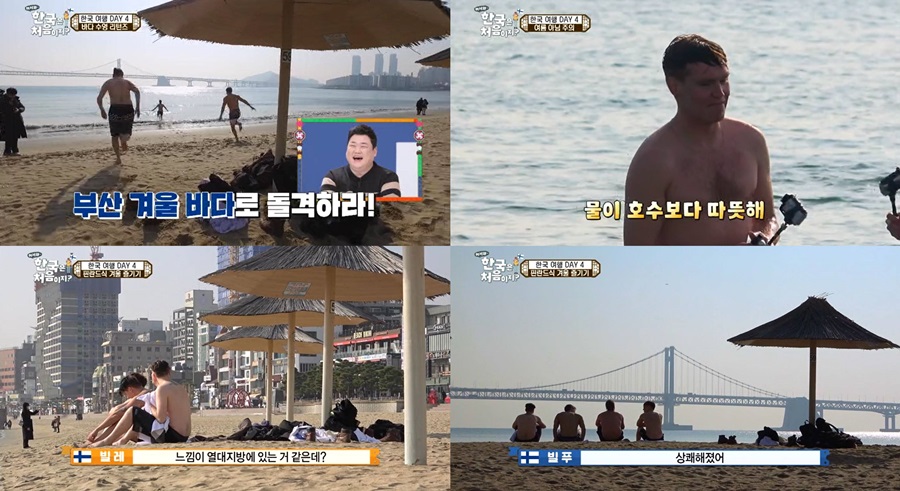 부산에 도착한 핀란드 친구들은 "너무 따뜻하다", "여름 같다"고 말하며 겨울이지만 따뜻한 날씨에 깜짝 놀랐다. 이후 핀란드 친구들은 짐을 내려놓더니 옷을 벗고 바다 수영을 시작했다.