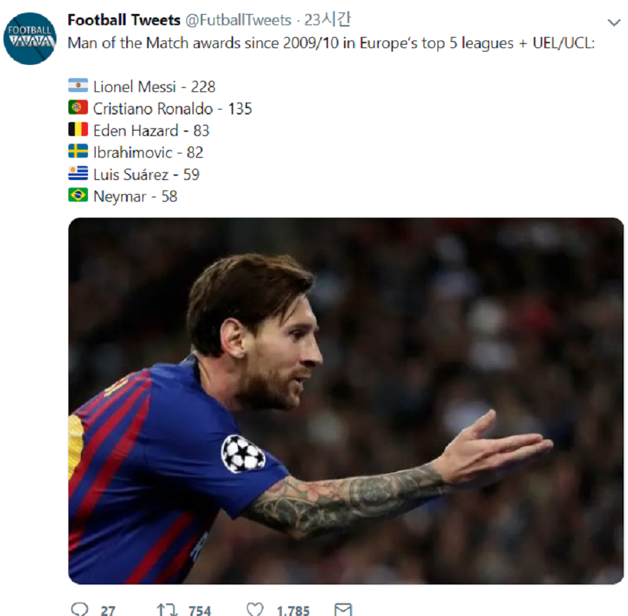 풋볼 트윗의 자료에 따르면 압도적으로 메시가 MOM에 선정된 수치가 높다. 메시는 총 228번의 MOM을 받았다. 2위는 호날두다. 138회로 메시와 차이가 크다.