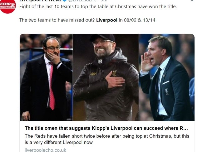 리버풀은 지난 크리스마스 기간 중 선두를 달리고 있었다. 최근 10년 동안 크리스마스 기간 중 1위를 차지하고 있는 팀을 우승 트로피를 들어 올렸다. '자멸'만 하지 않으며 우승이 유력하다고 봤다. 하지만 10년 동안 크리스마스 기간 중 1위를 차지하고도 우승하지 못한 2번(2008-09시즌, 2013-14시즌)이 모두 리버풀이라는 점에서 우려도 있었다. 이번엔 이런 우려를 지울지, 아니면 또 불행의 주인공이 될지 귀추가 주목된다.