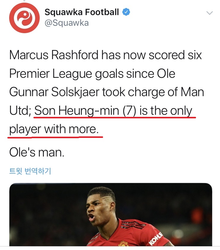 하지만 뛰는 래시포드 위에 나는 손흥민이 있었으니. 손흥민은 같은 기간 7골을 넣었다. 통계 업체 '스쿼카풋볼'은 래시포드의 득점력에 놀라움을 표시하면서 "래시포드가 솔샤르 감독 부임 이후 리그에서 6골을 넣었다. 오직 손흥민(7골)만 같은 기간 더 많은 득점을 기록한 선수"라고 칭했다. 래시포드를 칭찬했지만, 손흥민이 더 돋보이는 멘트였다.