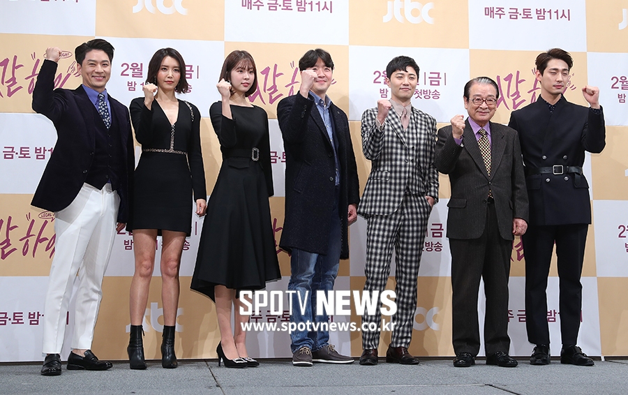 [스포티비뉴스=서울, 곽혜미 기자] JTBC 새 금토 드라마 ‘리갈하이’ 제작 발표회가 7일 오후 서울 강남구 논현동 임피리얼 팰리스 호텔에서 열렸다. 배우 정상훈, 채정안, 서은수, 김정현 PD, 진구, 이순재, 윤박(왼쪽부터)이 포즈를 취하고 있다.