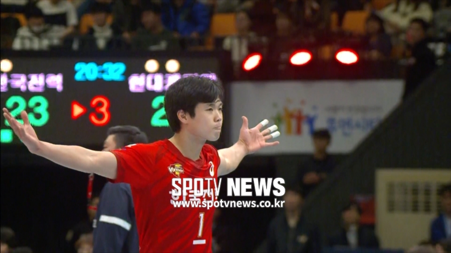 1세트에서 한국전력은 현대캐피탈의 김재휘 속공과 전광인 공격을 최석기와 서재덕이 각각 원천 봉쇄했는데요. 1세트 막판, 한국전력은 19-20에서 연속 6득점을 터뜨리는 기염을 토하며 1세트를 가져갔습니다.
