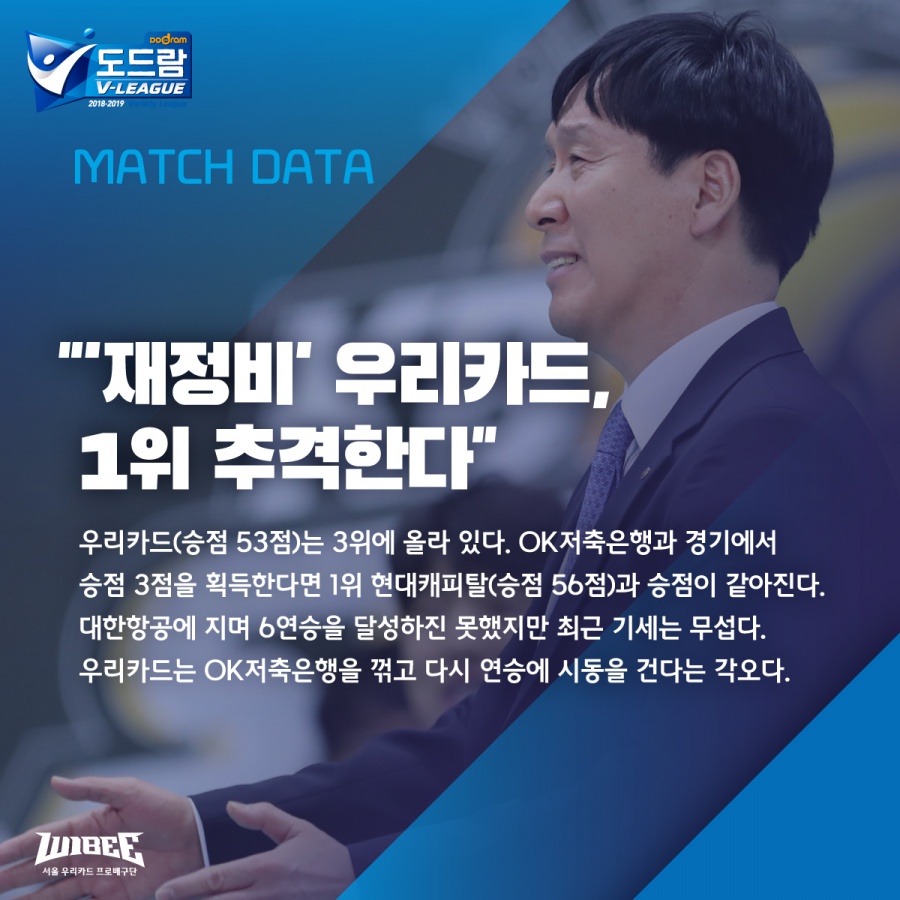 우리카드는 17승 11패 승점 53점으로 3위, OK저축은행은 14승 14패 승점 42점으로 5위를 기록하고 있다.