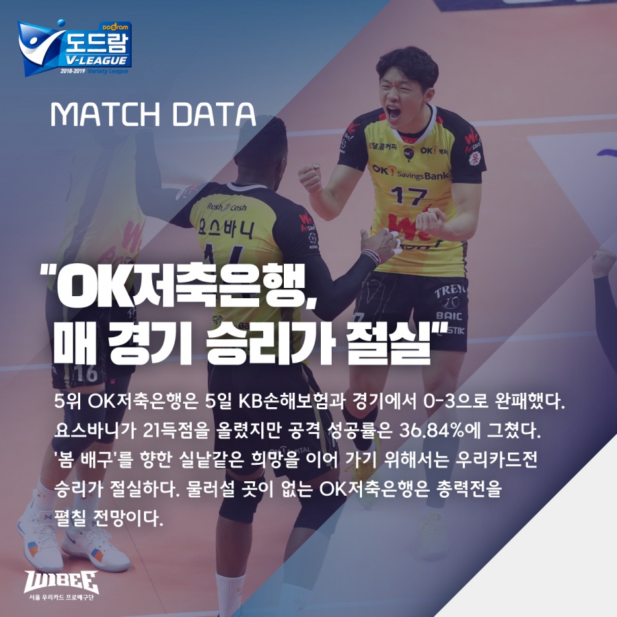 OK저축은행은 5일 KB손해보험과 경기에서 0-3으로 완패했다. OK저축은행이 '봄 배구'를 향한 실낱같은 희망을 이어가려면 우리카드전 승리가 절실하다. 물러설 곳이 없는 OK저축은행은 총력전을 펼칠 전망이다.