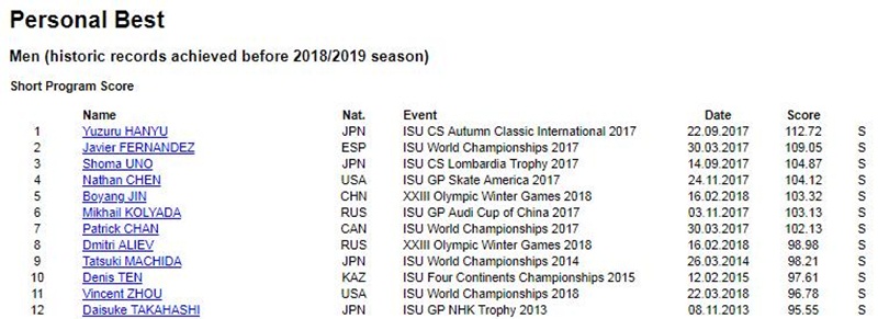 2014년과 2018년 올림픽에서 2연패를 달성한 하뉴는 역대 쇼트프로그램 최고 기록인 112.72점을 보유하고 있습니다. 시즌 최고 점수는 110.53점이죠. 최근 은퇴한 하비에르 페르난데스(스페인)은 109.05점으로 그 뒤를 이었고 평창 올림픽 은메달리스트인 우노 쇼마(일본)는 104.87점으로 역대 3위에 해당하는 점수를 받았습니다.