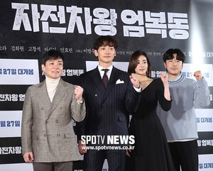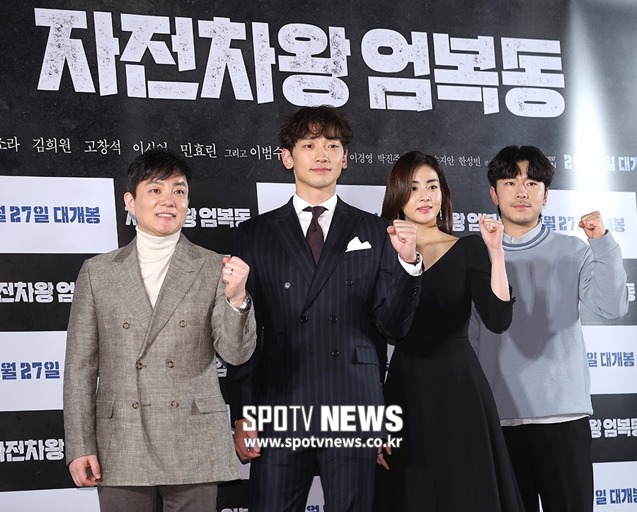 [스포티비뉴스=서울, 곽혜미 기자] 영화 '자전차왕 엄복동' 쇼케이스가 8일 오후 서울 송파구 잠실 롯데시네마 월드타워점에서 열렸다. 배우 이범수, 정지훈, 강소라, 이시언(왼쪽부터)이 포즈를 취하고 있다.