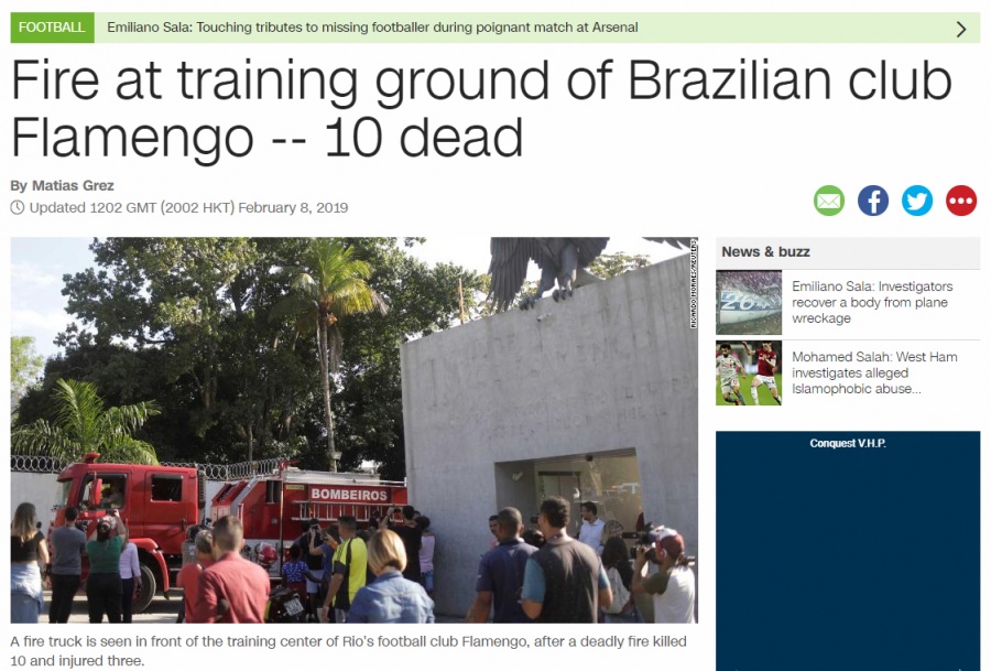 미국 방송국 'CNN'을 비롯한 다수 매체가 8일(한국 시간) "브라질 축구 팀 플라멩구의 유소년 훈련장에 발생한 화재로 10명의 사람이 숨지고 최소한 3명이 부상했다"고 보도했다. 유스 선수들의 기숙사에서 불꽃이 솟았고, 선수들은 잠을 자고 있었다.