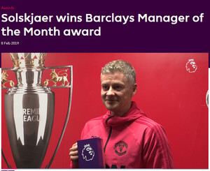 프리미어리그 사무국은 공식 홈페이지에 8일(한국 시간) "맨체스터유나이티드 솔샤르 감독이 이달의 감독상을 받았다"고 발표했다. 맨유 감독으로선 2012년 알렉스 퍼거슨 전 감독이 수상한 이후 최초다.