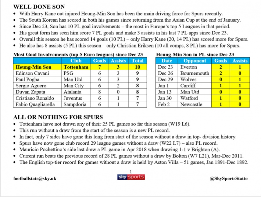 이어 이 자료는 손흥민이 14골(프리미어리그 10골)을 넣고 있으며 오직 케인(20골, 프리미어리그 14골)만 토트넘에서 더 많은 득점을 올리고 있으며, 8개 도움(프리미어리그 5개)을 기록해 크리스티안 에릭센(10도움, 프리미어리그 8도움)만이 손흥민보다 더 많은 도움을 올렸다고 조명했다.