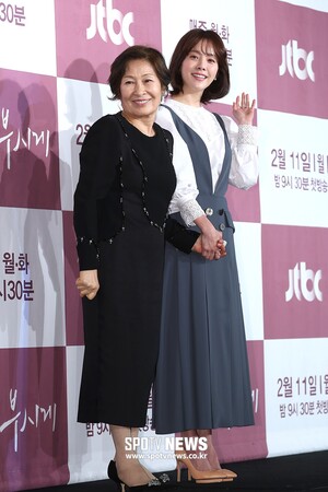 [스포티비뉴스=서울, 곽혜미 기자] JTBC 새 월화 드라마 '눈이 부시게' 제작 발표회가 11일 오후 서울 영등포구 여의도 콘래드호텔에서 열렸다. 배우 김혜자와 한지민이 포즈를 취하고 있다.