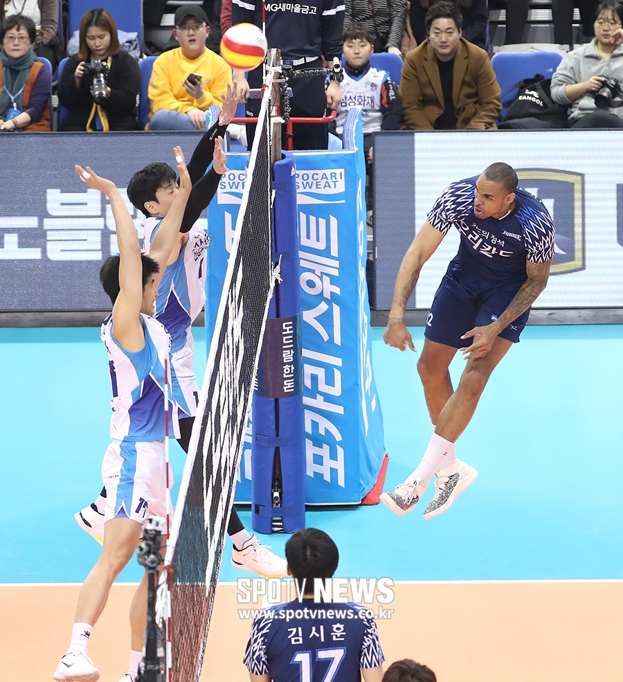 [스포티비뉴스=대전, 곽혜미 기자] 2018-2019 도드람 V리그 남자부 삼성화재와 우리카드의 경기가 12일 오후 대전 충무체육관에서 열렸다. 우리카드 아가메즈가 터치아웃을 노리고 있다.