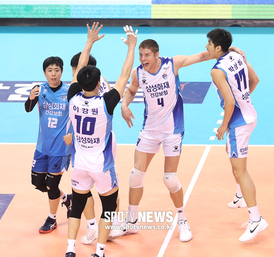 [스포티비뉴스=대전, 곽혜미 기자] 2018-2019 도드람 V리그 남자부 삼성화재와 우리카드의 경기가 12일 오후 대전 충무체육관에서 열렸다. 득점에 성공한 삼성화재 선수들이 기뻐하고 있다.