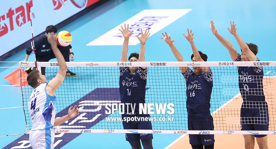 [스포티비뉴스=대전, 곽혜미 기자] 2018-2019 도드람 V리그 남자부 삼성화재와 우리카드의 경기가 12일 오후 대전 충무체육관에서 열렸다. 우리카드 노재욱, 윤봉우, 나경복이 블로킹을 시도하고 있다.