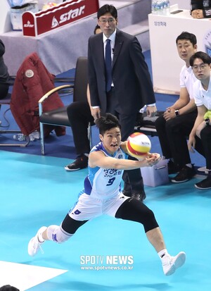 [스포티비뉴스=대전, 곽혜미 기자] 2018-2019 도드람 V리그 남자부 삼성화재와 우리카드의 경기가 12일 오후 대전 충무체육관에서 열렸다. 삼성화재 김형진이 디그를 하고 있다.