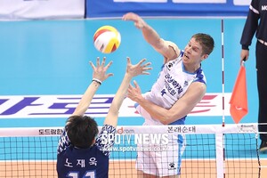 [스포티비뉴스=대전, 곽혜미 기자] 2018-2019 도드람 V리그 남자부 삼성화재와 우리카드의 경기가 12일 오후 대전 충무체육관에서 열렸다. 삼성화재 타이스가 공격을 시도하고 있다.