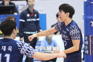 [스포티비뉴스=대전, 곽혜미 기자] 2018-2019 도드람 V리그 남자부 삼성화재와 우리카드의 경기가 12일 오후 대전 충무체육관에서 열렸다. 우리카드 김시훈이 블로킹에 성공한 후 기뻐하고 있다.