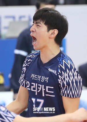 [스포티비뉴스=대전, 곽혜미 기자] 2018-2019 도드람 V리그 남자부 삼성화재와 우리카드의 경기가 12일 오후 대전 충무체육관에서 열렸다. 우리카드 김시훈이 블로킹에 성공한 후 기뻐하고 있다.