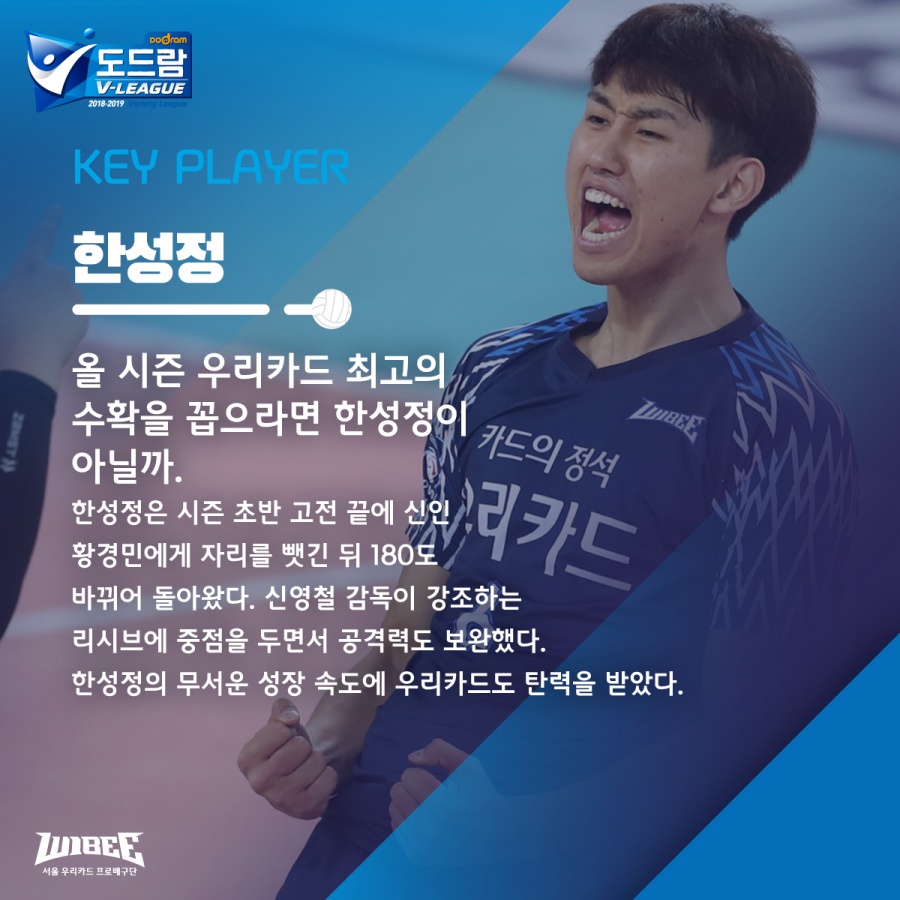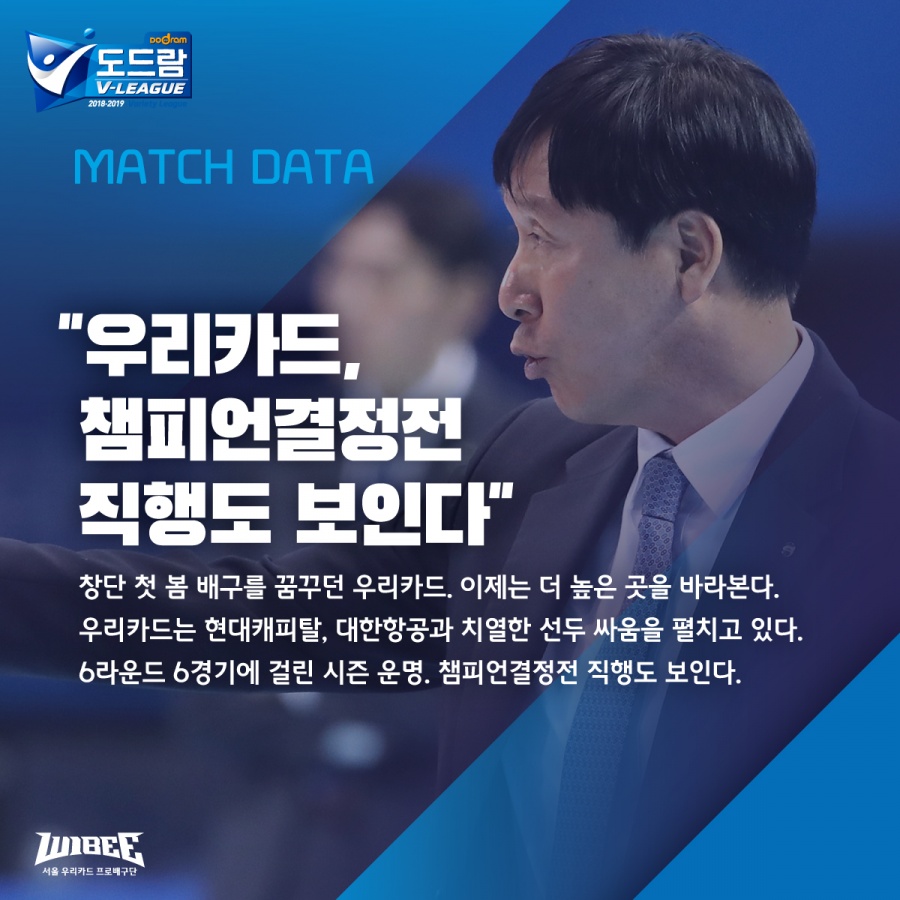 우리카드는 창단 첫 봄 배구를 넘어 더 큰 꿈을 꾸고 있다. 우리카드는 16일 현재 19승 11패 승점 59점을 기록하며 현대캐피탈, 대한항공과 치열한 선두 싸움을 펼치고 있다. 시즌 운명을 결정할 마지막 라운드에서 우리카드는 내친김에 선두까지 바라보고 있다. 챔피언결정전 직행도 보이는 상황이다.