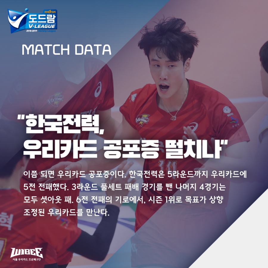 한국전력은 올 시즌 우리카드에 유독 약했다. 3라운드 세트스코어 2-3 패배로 승점 1점을 뺏은 게 전부. 나머지 4경기는 모두 셧아웃 패했다. 우리카드 상대 시즌 전패의 갈림길에서 시즌 1위를 목표로 질주하고 있는 우리카드를 만난다.